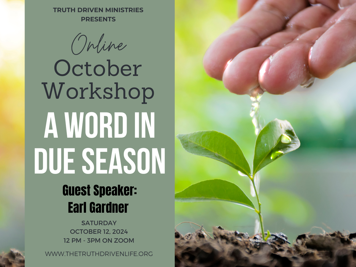 Earl Gardner will be the Guest Speaker at Truth Driven Ministries’ ONLINE October Spiritual Growth Workshop. A Word in Due Season | Guest Speaker: Earl Gardner All are welcome to...
